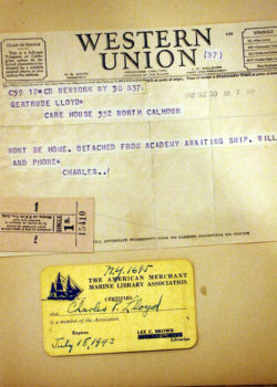 Charles Payne Lloyd enrolled in the U.S. Maritime Commission Cadet Corps in August 1942. As a Deck Cadet he sailed the world aboard the SS Thomas Sim Lee from October 1942 to June 1943 ranging from Casablanca to Western Australia. After this date, the next time Charles shows up in the public record is as a 3rd Mate aboard the Isthmian Lines managed SS Poland Victory having signed on March 9, 1944. The last ship he sailed on was the Isthmian Lines managed SS Thomas Cresap , after having signed on as 2nd Mate on December 15, 1944.