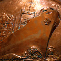 A [circular plaque] depicting a ship at seas with “Gallant Ship” in twisted rope typeface below ship. Artist’s name and date inscribed.