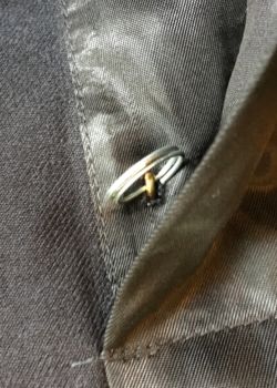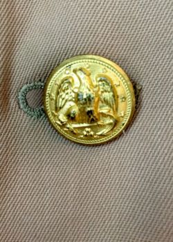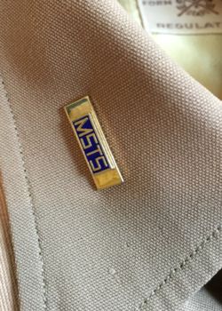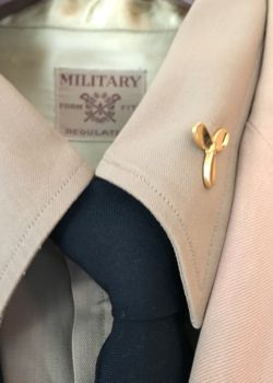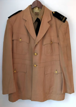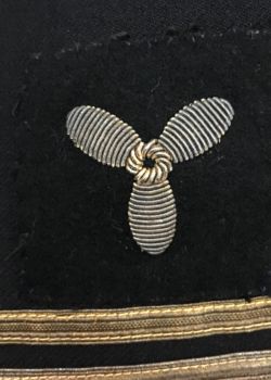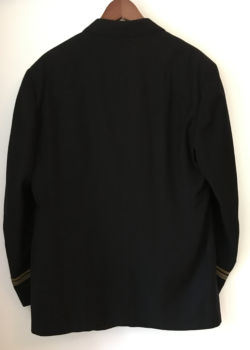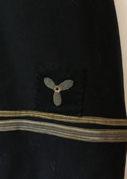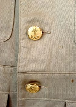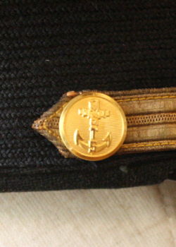 The “dragging” anchor – a horizonal anchor – with the letters MSTS placed on the shank dates the uniform from 1950 through 1965. Note the lack of a sword-slit in the reefer; this small detail belies the fact that the uniform was purchased at a civilian uniform shop for merchant mariners.