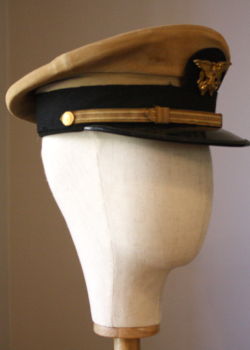 The cap is transitional and in its present configuration would be worn in a wear-out period. Usually, the U.S. Navy published changes to uniform regulations that specified the period of time for new uniform and insignia to be changed. This cap has the old-style MSTS officer’s cap badge along with second-style of MSTS buttons (in use from 1965 through August 1970). Of interest is the cap band – it is that of a U.S. Navy commissioned officer; MSTS officers had cap bands that followed the edges of their badges.