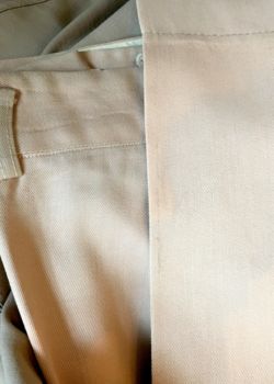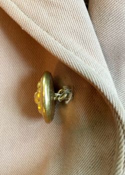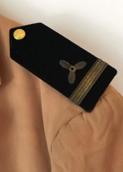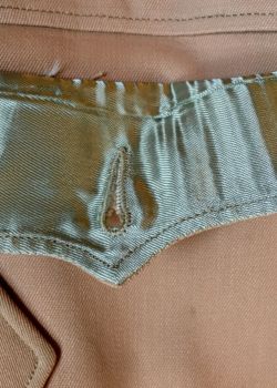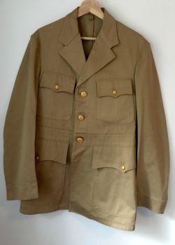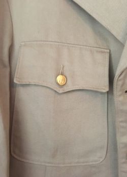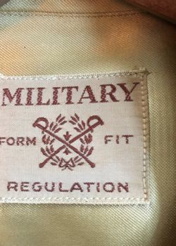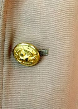 The khaki uniform was the working uniform of officers aboard MSTS vessels. The almost daily use is indicated by the absence of gilt from the high-relief areas on the buttons – this suggests repeated thumbing of the buttons to secure and remove the coat. Of note is the design of the buttons: whereas the reefer has MSTS buttons, this uniform coat has U.S. Navy officer and CPO buttons. The buttons are sewn on to the coat, meaning the coat was purchased with the buttons affixed and the owner decided against purchasing another set specifically for the coat. Often, if buttons are removable, they are interchanged between blue and khaki coats.