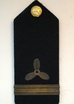 All items on this page are from a single individual who had the surname Bishop. The blue uniform has the cuff lace of a Third Assistant Engineer; whereas the shoulder boards worn on the khaki coat are those of a Fourth Assistant Engineer or Licensed Junior Engineer – yet the collar devices on the khaki shirt are those of a Third Assistant Engineer.