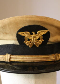 The cap is transitional and in its present configuration would be worn in a wear-out period. Usually, the U.S. Navy published changes to uniform regulations that specified the period of time for new uniform and insignia to be changed. This cap has the old-style MSTS officer’s cap badge along with second-style of MSTS buttons (in use from 1965 through August 1970). Of interest is the cap band – it is that of a U.S. Navy commissioned officer; MSTS officers had cap bands that followed the edges of their badges.