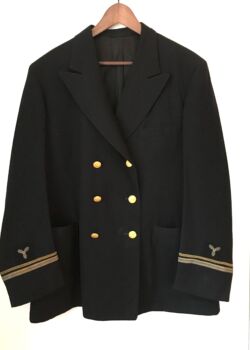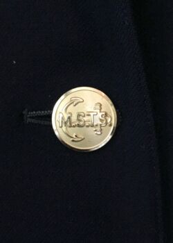 The “dragging” anchor – a horizonal anchor – with the letters MSTS placed on the shank dates the uniform from 1950 through 1965. Note the lack of a sword-slit in the reefer; this small detail belies the fact that the uniform was purchased at a civilian uniform shop for merchant mariners.