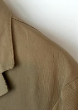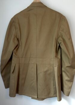 The khaki uniform was the working uniform of officers aboard MSTS vessels. The almost daily use is indicated by the absence of gilt from the high-relief areas on the buttons – this suggests repeated thumbing of the buttons to secure and remove the coat. Of note is the design of the buttons: whereas the reefer has MSTS buttons, this uniform coat has U.S. Navy officer and CPO buttons. The buttons are sewn on to the coat, meaning the coat was purchased with the buttons affixed and the owner decided against purchasing another set specifically for the coat. Often, if buttons are removable, they are interchanged between blue and khaki coats.