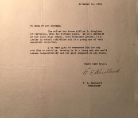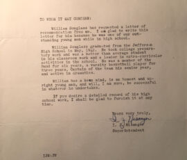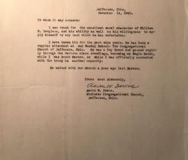 Bill was born on August 10, 1924, to Frank Crosby and Ruth (Fredericks) Douglass in Augusta, Ga. Bill was a lifelong resident of Jefferson. He was a 1942 graduate of Jefferson High School and earned The Eagle Scout Award. He attended Miami University in Oxford, Ohio, before accepting a congressional appointment to the United States Merchant Marine Academy, graduating in 1944.
