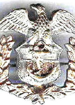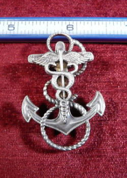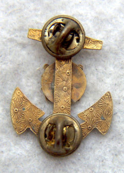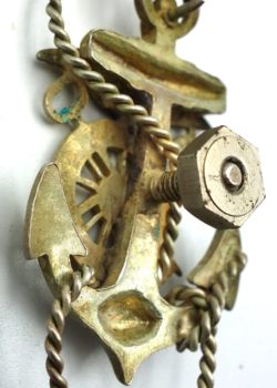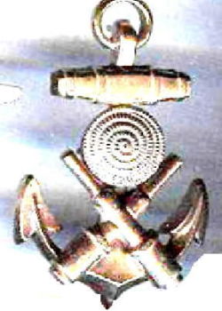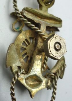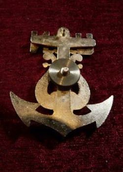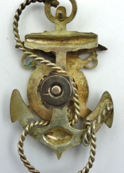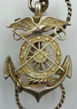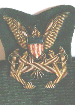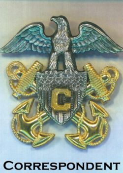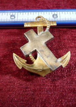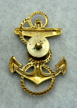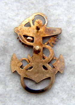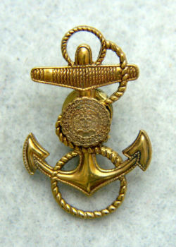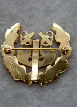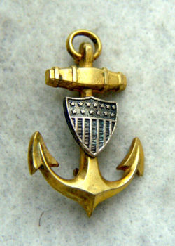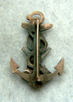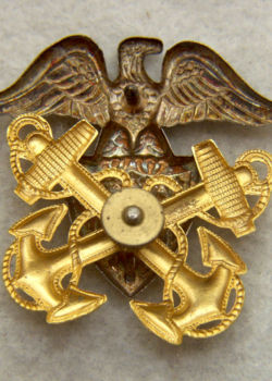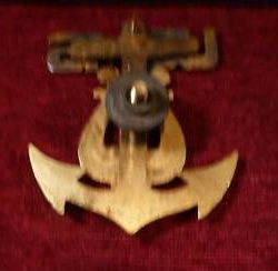 Students of naval insignia will note that on this particular hat badge is the fact that the star is not of the type used by any of the licensed manufacturers of US Military establishment insignia, and and the anchor itself is that of a US Navy ROTC/Annapolis midshipman. The only US CG&S true device is the triangle within the circle.