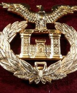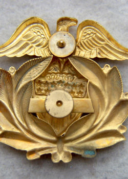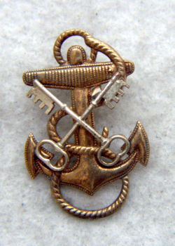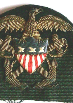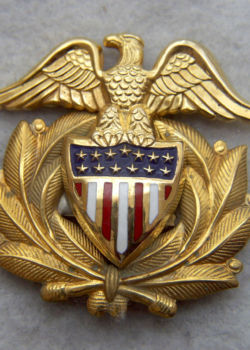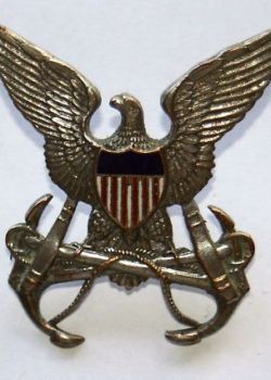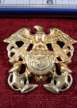 This is a fantasy, and a fun one, at that. Following the interwar US Army penchant for identifying units by placing small devices on other pieces of insignia – numbers and Corps devices (for example), this places a miniature Quartermaster Corps device on the shield of a US Navy Commissioned Officer’s hat badge.