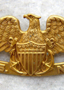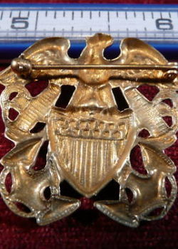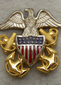 This is not quite a restrike. The die was designed, yet the badges never went into production. I have an actual, issued US Navy Commissioned Officer hat badge of the “pre-1940s” type in another post. Alan also had this badge as what he called a WSA cap badge. The WSA badge had bronze anchors and three stars on the shield; this would have been a fantasy issue since the WSA never issued such a badge; the three stars were a misunderstanding/attribution of MMP cap badges with the thought of what a USSB cap badge would have looked like.