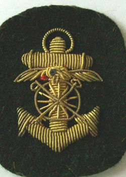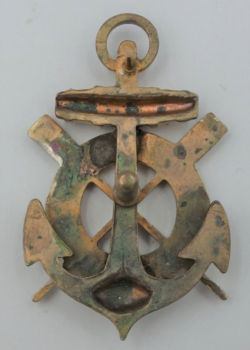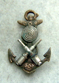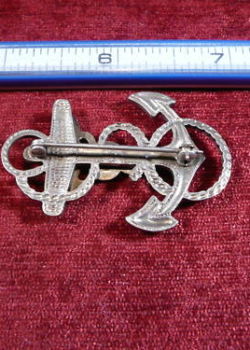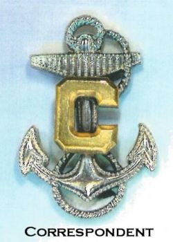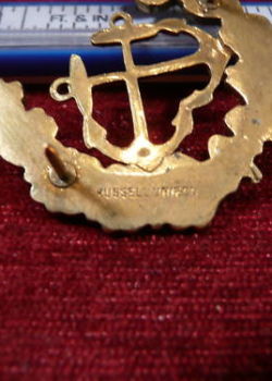 Unofficial Issue: An item produced by a commercial firm and available from the firm or a vendor for the purpose of providing seamen a replacement of the official issue or an interim item to wear until the distribution of the official issue. These are “theatre manufactured” items and include sand casts of cap badges as found in collections as picked up by seamen in foreign ports as far afield as Alexandria or Sydney. I would also include items manufactured under license for general distribution, but not released (see Russell Uniform Co. below).