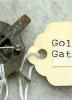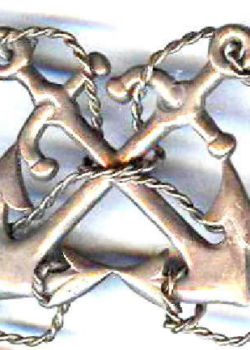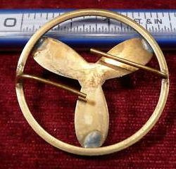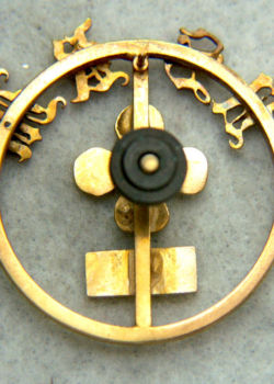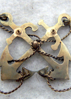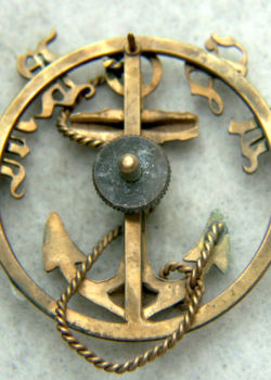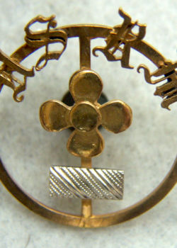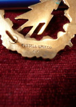 This device comes up in online auctions from time-to-time with examples in bronze. Alan’s signature is the hand-applied and soldered “rope.” The wire is loose, and the reverse solder is sometimes blotchy. His pieces have N.S. Meyer hallmarks – this is due to the fact he purchased many unfinished pieces and dies were sold at auction in the 1990s when the N.S. Meyer plant closed – every year about 3-4 of these badges find their way to sale.