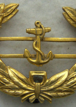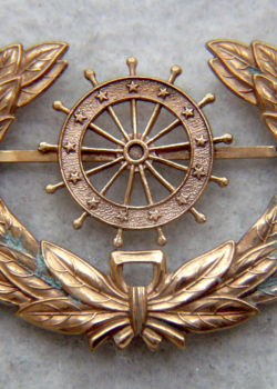 This badge is a mash-up of ideas. It was not until 1968 that the US Navy Uniform Board approved a Master and Senior Chief Petty Officer cap insignia – similar to their collar devices, with one or two silver stars superimposed on the anchor, inverted and centered on the stock. The US Coast Guard soon followed the US Navy’s lead in 1970, as did the regulations for US C&GS/NOAA. The US C&GS had a small core of Chief Petty Officers up until the 1950s, afterward they converted to unlicensed, un-uniformed Federal, civil-service employees. Proposed insignia tables were published in 1965 without examples being produced. With the transfer of the agency to the Environmental Science Services Administration, all non-commissioned officer positions were removed and finally ceased to be with the 1970 reorganization into the National Oceanic and Atmospheric Administration.