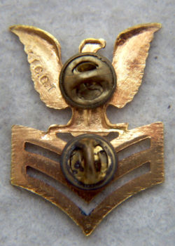 After I wrote the above, I contacted Alan, and he mentioned the cards he provided with the insignia were sometimes privately printed. He did admit to combining some USN warrant officer pins with Russell Uniform Company wreaths – just look for the sheared-off posts. If there is pitting, the wreaths were cast by him.
