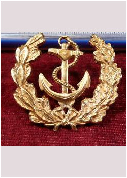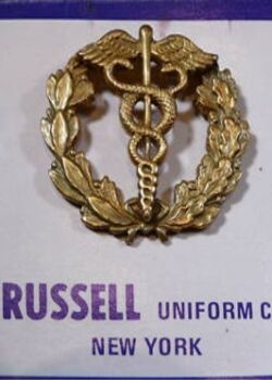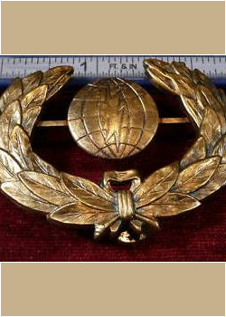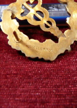 There was no going-out-of-business sale, and the unpublished regulations were made up. The United States Maritime Service used U.S. Navy warrant officer devices on collars and garrison hats; the only wreathed insignia were found on cuffs devices and shoulder boards. Russell Uniform Company did exist, it was a seller of police insignia and once the official uniform providers to the New York Police Department and New York State Police. Particularly problematic regarding much of the insignia is its corrosion – wartime insignia was not made of brass; especially when these items were purported to have come out: 1944-1945.