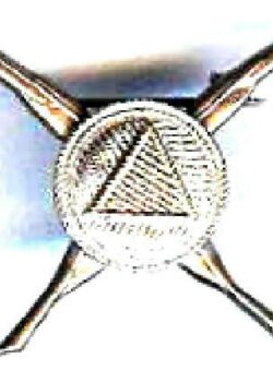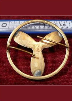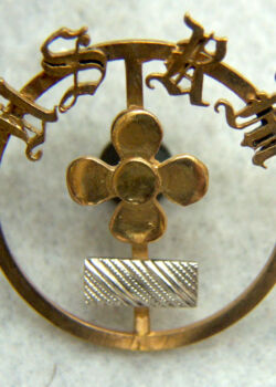 This device comes up in online auctions from time-to-time with examples in bronze. Alan’s signature is the hand-applied and soldered “rope.” The wire is loose, and the reverse solder is sometimes blotchy. His pieces have N.S. Meyer hallmarks – this is due to the fact he purchased many unfinished pieces and dies were sold at auction in the 1990s when the N.S. Meyer plant closed – every year about 3-4 of these badges find their way to sale.