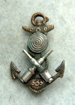 Unofficial Issue: An item produced by a commercial firm and available from the firm or a vendor for the purpose of providing seamen a replacement of the official issue or an interim item to wear until the distribution of the official issue. These are “theatre manufactured” items and include sand casts of cap badges as found in collections as picked up by seamen in foreign ports as far afield as Alexandria or Sydney. I would also include items manufactured under license for general distribution, but not released (see Russell Uniform Co. below).