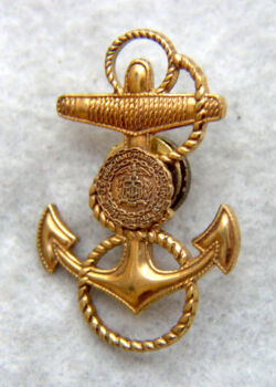 This is a fantasy, and a fun one, at that. Following the interwar US Army penchant for identifying units by placing small devices on other pieces of insignia – numbers and Corps devices (for example), this places a miniature Quartermaster Corps device on the shield of a US Navy Commissioned Officer’s hat badge.