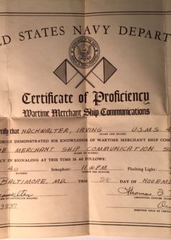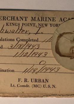 Mr. Irving Nachwalter volunteered early to join the ranks of cadet-midshipmen at the United States Merchant Marine Academy at Kings Point. He entered the program in the Summer of 1942 and in nine months, he was shuttling cargo to Suez. Cadet-midshipmen came from all walks of life and often had scant maritime experience – he was no exception: he came with none. At the time of his enrollment, he was living in Coney Island with his parents, a student at New York City College, and working full-time as a clerk for Alfred Dunhill, a tobacco import business. He was a first-generation immigrant, his father having fled the then Polish city of Lvov during a period of increased Russian pogroms in 1913 – six years prior to his birth. He was also one of the first Jewish graduates of the Academy.