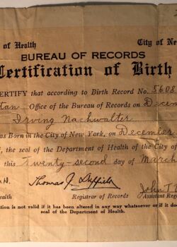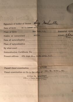 In 1943 he married Beatrice Polan, and by 1948, Mr. Nachwalter left the merchant service and worked as a manager at Amity Plastics Company, commuting from Perth Amboy to Manhattan. His marriage fizzled, he divorced and then later married fellow Brooklynite Miss Lilian Bernstein in 1952. Afterward, he settled permanently in Brooklyn, and remained in Brighton Beach with Lilian until her passing away in 1982. He passed away in 1990, reaching his seventieth year.