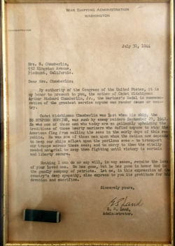Cadet Midshipman Chamberlin was lost when his ship, the SS STEPHEN HOPKINS, was sunk by enemy raiders September 27, 1942. He was one of those men who today are so gallantly upholding the traditions of those hearty mariners who defied anyone to stop the American flag from sailing the seas in the early days of this republic. He was one of those men upon whom the Nation now depends to keep our ships afloat upon the perilous seas – to transport our troops across the sea; and to carry the vitally needed material to keep them fighting until victory is certain and liberty secure.