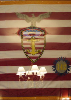 142 is a special number. It’s the number of USMMA midshipmen who lost their lives in combat during WWII while embarked onboard transport and resupply vessels supporting our Nation’s Armed Forces. […] In memory of the 142, the battle standard bears the number “142” on its field of red, white and blue. In its center is the eagle of the Academy’s seal in blue and gray, the school colors, and the anchor of the merchant marine in gold. From its top hang the ribbons which represent the various combat zones in which the Academy’s cadet-midshipmen served.