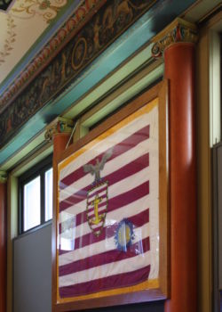 An example of the Battle Standard may be found in the center of Wiley Hall, the veritable heart of the Academy (above), and another behind glass at the nearby American Merchant Marine Museum (see below). The latter is installed in a beautiful space called the “142 Gallery” along with a permanent exhibit, “Remembering the 142.” In the same room are a framed citation, a medal, a ribbon, and a photo of their posthumous recipient. It truly is a place of quiet contemplation, where the distance of time almost makes the sacrifices of the 142 feel like a foreign country.