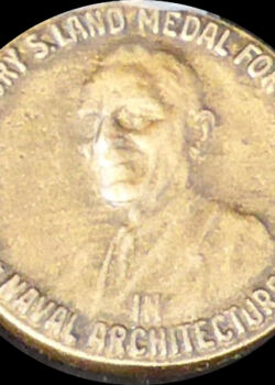 Below, please find the sixth awarded Admiral Land Medal and an example of the current medal. The original medal was gilded bronze. As a design note, Admiral E. S. Land has a Maritime Commission “V” pin on his coat lapel. The present medal appears to be a cast in a base metal. (click on images for higher resolution examples)