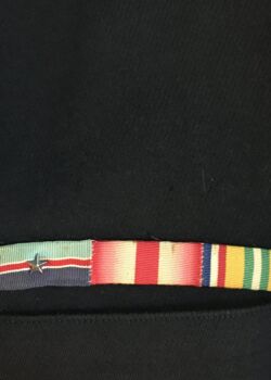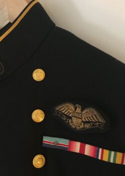 This is one of the most exciting uniforms sets I have come across in regard to period insignia and overall condition. The whites and dress blues are relatively pristine; the whites’ coat, in particular, is still starched and ribbons are stain-free. It is an excellent uniform from a war veteran.