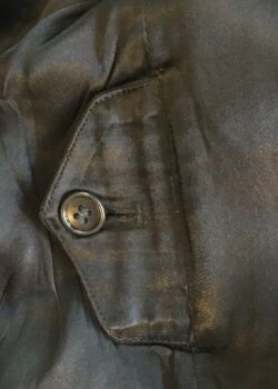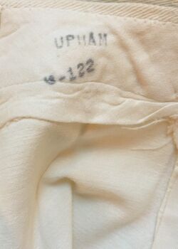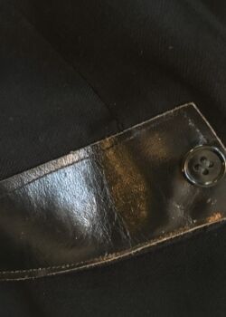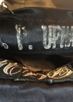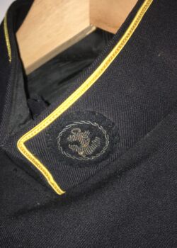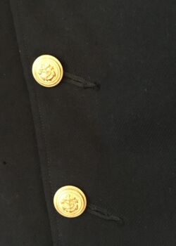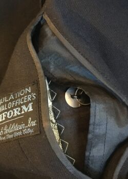 The round coat’s original United States Naval Reserve (USNR) badge was removed at some point; in its place, I have substituted a badge that was found in one of the uniform’s pockets. Please see the discussion below about loose pieces of insignia found in Mr. Upham’s uniforms.