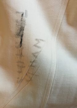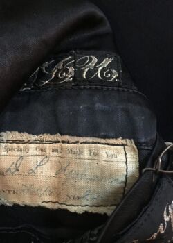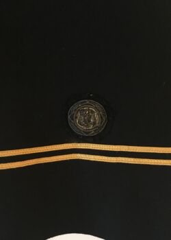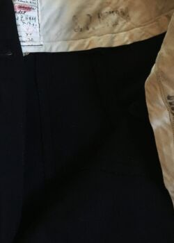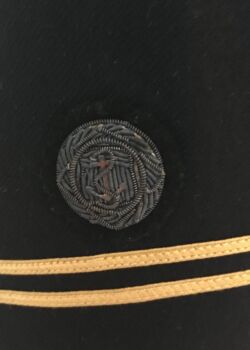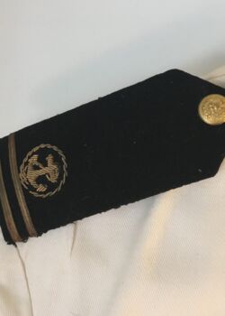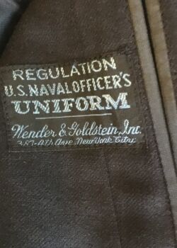 The absence of the tell-tale markers of a cadet-midshipman’s uniform – shadows of collar dogs and a USNR badge, and removed cuff braid – was then evident; the uniform was not worn at Kings Point. In the pocket of the reefer were two USMS cuff devices; presumably, they were sewn on and removed from the reefer – do not know if they were sewn on at one point and replaced or were to replace the executive stars. This uniform, if worn in the capacity of a U.S. Navy officer would only be acceptable in April 1949 – when Merchant Marine ribbons were permitted on U.S. Navy uniforms. Taking all components together that face-value, this uniform may have been worn on a merchant ship where the managing operator stipulated licensed officers wore executive stars.