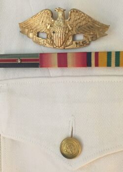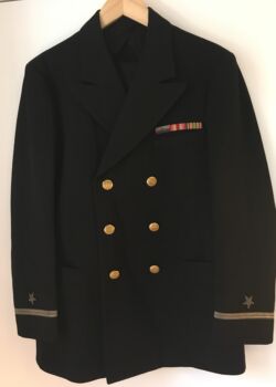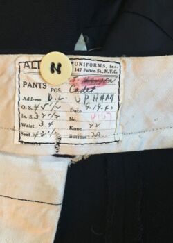The following uniforms were owned by David Lanning Upham. He matriculated at Kings Point in late-1943 or early-1944 and graduated in 1946. He was enrolled in the Deck program in Section 253, and attained the rank of Lieutenant (Junior Grade) in the Second Battalion, Company Twelve. His ribbons attest to his membership in the “Tin Fish Club,” and his voyages in the Atlantic and Mediterranean War Zones.