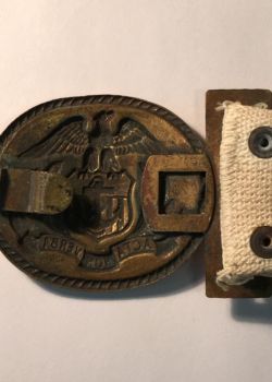 The white belt with the polished brass buckle is from late war; the buckle’s style has remained the same for decades after its creation. It was worn over the waist, between the seventh and eighth buttons.