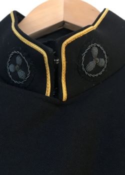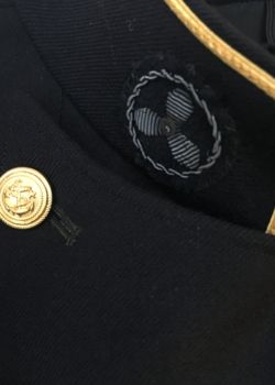The Cadet Corps did not start wearing round coats with double rows of buttons until July 1943 several months ahead of the dedication of Kings Point in September 1943. This same style of uniform was worn by midshipmen at Annapolis since at least the 1890s; the cut of which was standardized in the 1930s. Rationing and mass-production of uniforms took away some of the exquisite detail as found in round coats manufactured prior to the Second World War as is evident in this immediate post-war example (by comparison, see a 1940 Annapolis example).