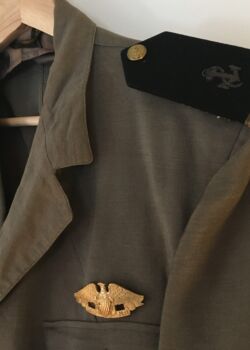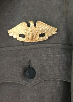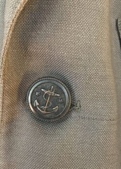 However, the presence of the buttons is not proof of the uniform being worn or issued at Kings Point – I have no photographic evidence of cadet-midshipmen ever wearing grays – only a graduate (see below). These same buttons were worn by members of the ATS; thus it may be a case of button re-appropriation by suppliers. And ATS deck officers did wear these generic shoulder boards. Yet, the USNR badge in combination with the junior rank does point to the owner being a Kings Pointer.