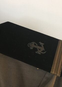 If we are to follow U.S. Navy regulations for the placement of the rank insignia, the rank pin is supposed to be on the seam. In taking a closer look at the rank device on the cap, it does not match the lace on the boards affixed to the coat – it does match an unphotographed pair of USMS lieutenant boards that were in the pocket along with the cap.