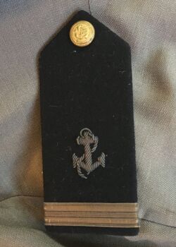 Not content with simply adding a new work uniform to replace the khaki, Admiral King decided to re-think the traditional service dress blue uniform – the classic officer rig of a reefer with six buttons – several months later after the announcement of the grays. With the adoption of grays, the khaki uniform was to be phased out. For visor caps (combination caps), the idea was gold chinstraps and scrambled eggs on visors would only be worn with dress blue and white uniforms; for service dress blues, and working khakis and working grays, the visor cap would have a black chinstrap with black buttons and plain visors. Muddling matters, blue service dress coats (reefers) would be worn with a gray instead of a white shirt – the gray shirt would have the collar insignia approved for the khaki shirt. As a cost-saving measure, the reefer was to have stripes on the outside of the cuff, and not all the way around. Grays also had blue-black plastic buttons, and the initial working gray shoulder boards were rounded at the top and covered in gray cloth with rank denoted by black lace.