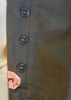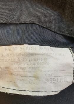 Of particular interest with this uniform are the blackened bronze buttons and the either “vegetable ivory” or rubber buttons. These are positively black instead of the blue-black of U.S. Navy regulations and are the star-anchor-star design of the U.S. Merchant Marine Academy Cadet Corps. The shoulder boards are those of a third mate with cap-bodkin buttons of the same pattern as the buttons on the coat.