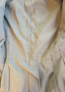 The garrison cap was in the pocket of the working gray uniform’s coat. It is not as faded as the rest of the uniform and is in relatively good condition. Both visor and garrison cap were authorized for wear with grays. A garrison cap would be worn solely aboard ship or at shore installations; a visor cap could be worn “walking out.”