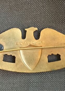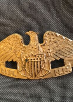 As for cap ornamentation, only the standard U.S. Navy Officer cap badge was authorized on visor caps with gray covers. Some collectors of U.S. Navy insignia claim large-size bronze U.S. Navy Officer cap badges were worn – this is incorrect; the only bronze cap badges manufactured during the Second World War were miniature devices for wear on the visor caps of U.S. Navy Officers assigned to U.S. Marine Corps units (vid. BuPers Circ. Letter 47-44, 31 March 1944). Other collectors surmise black full-size cap badges were worn; however, these are post-war Balfour productions for use on pith helmets in Southeast Asia during the Vietnam War. The black cap badges are an early (failed) example of the U.S. Navy’s attempt to subdue all metal insignia. The logic is understandable given the Navy’s mania for matching insignia components – although grays tossed all reason aside!
