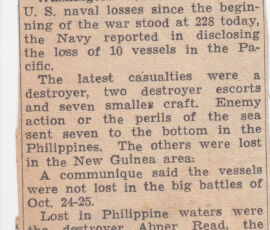 During the Second World War, he was a lieutenant and the chief engineer on the USS Abner Read. Â The ship – a destroyer – was sunk in the Battle of Leyte Gulf in November 1944. Â Prior, the ship was severely damaged by a mine near Alaska; he received a commendation for helping get the ship back to port after the mining.